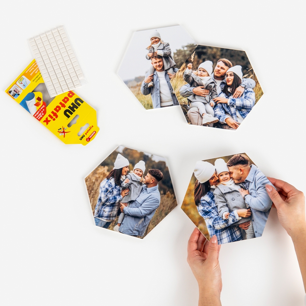Escolhe entre o formato quadrado ou hexagonal e cria as tuas composições únicas e personalizadas com os Quadro Adesivo x UHU. Que tal transformar a parede da tua sala numa galeria de arte moderna, com um mural de fotografias das tuas viagens favoritas? Ou criar um ambiente acolhedor no quarto, com uma disposição de quadros que conte a história com a tua cara metade?